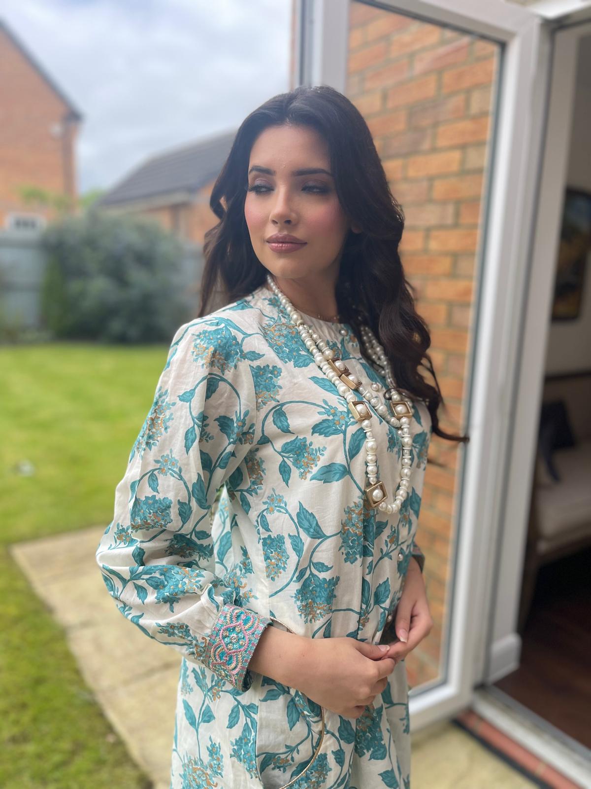 This women's two-piece set features a cotton mix breathable fabric for ultimate comfort. The top is adorned with embroidered cuff sleeves and includes practical pockets, blending functionality with elegance. Paired with chic cigarette trousers, this ensemble is perfect for a polished, everyday look. Embrace style and comfort effortlessly with this versatile outfit.