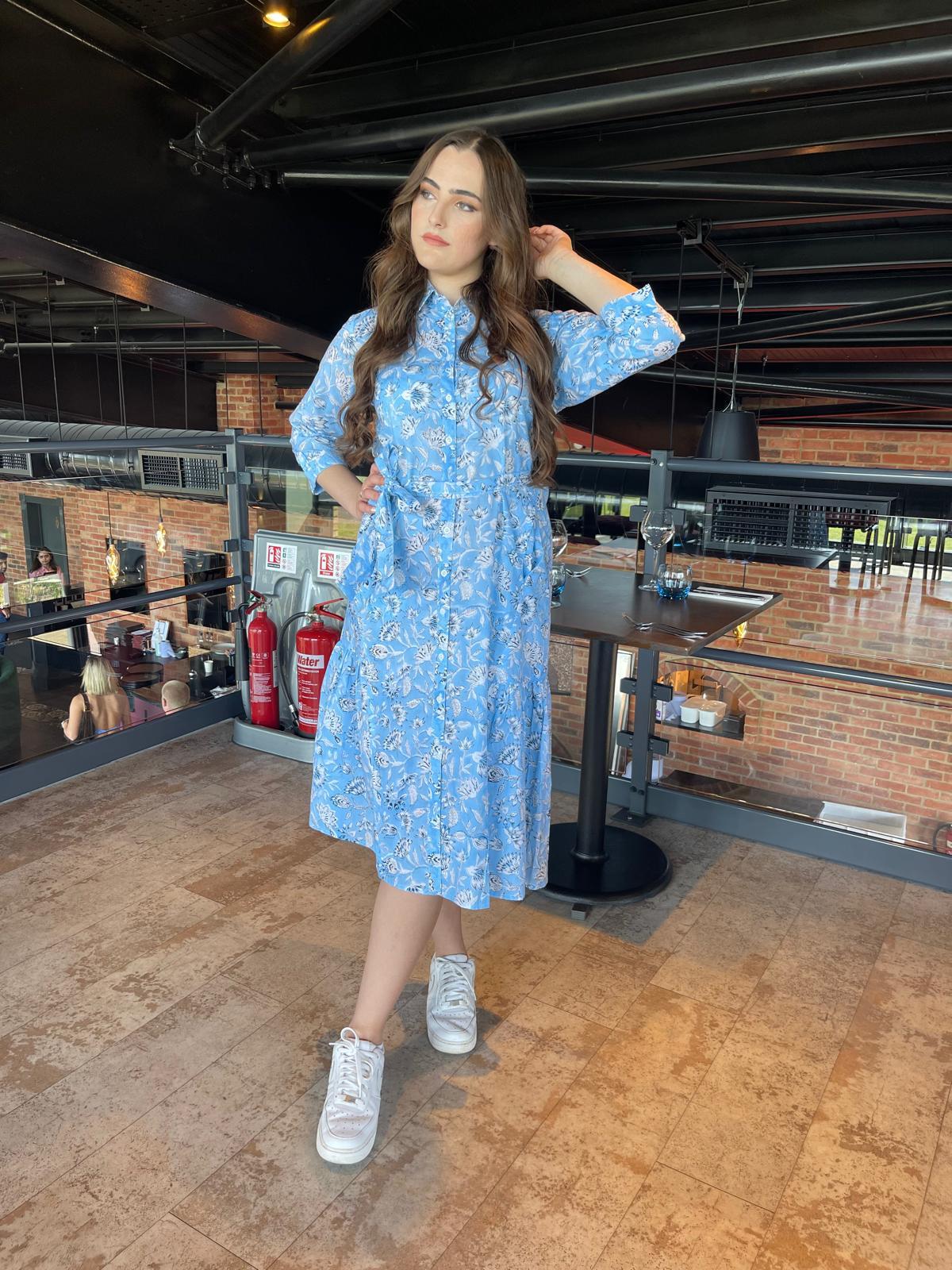 The vibrant sky blue print adds a touch of bohemian flair, making it perfect for both casual outings and special occasions.