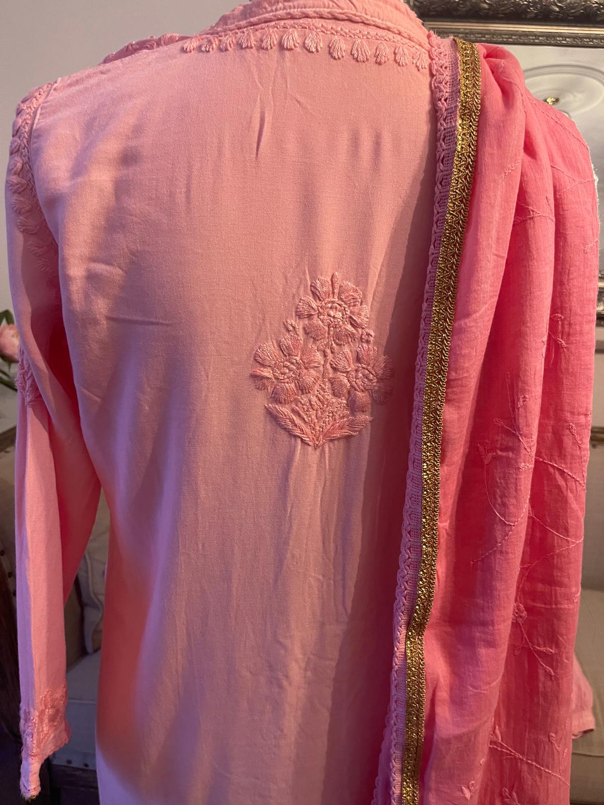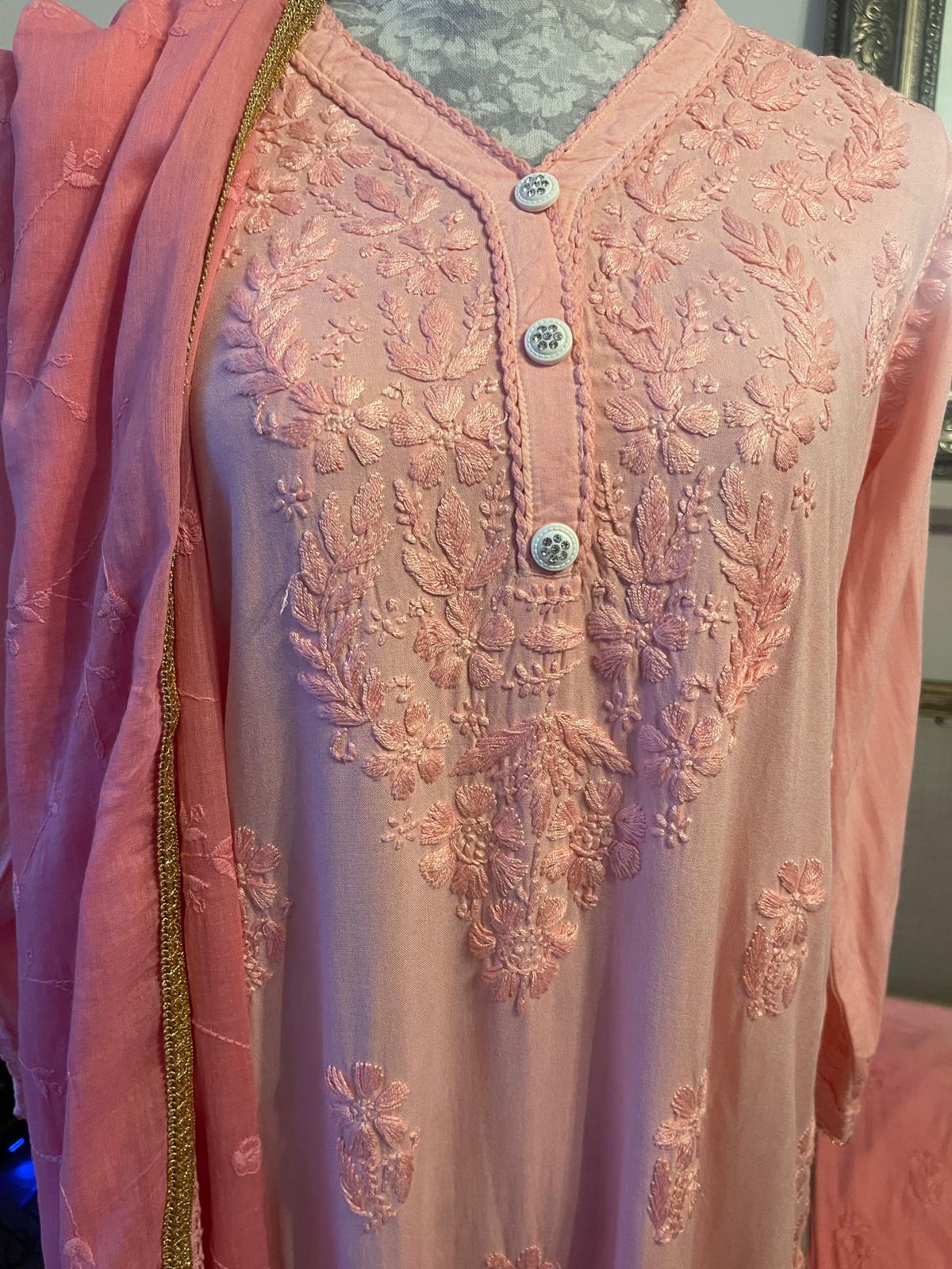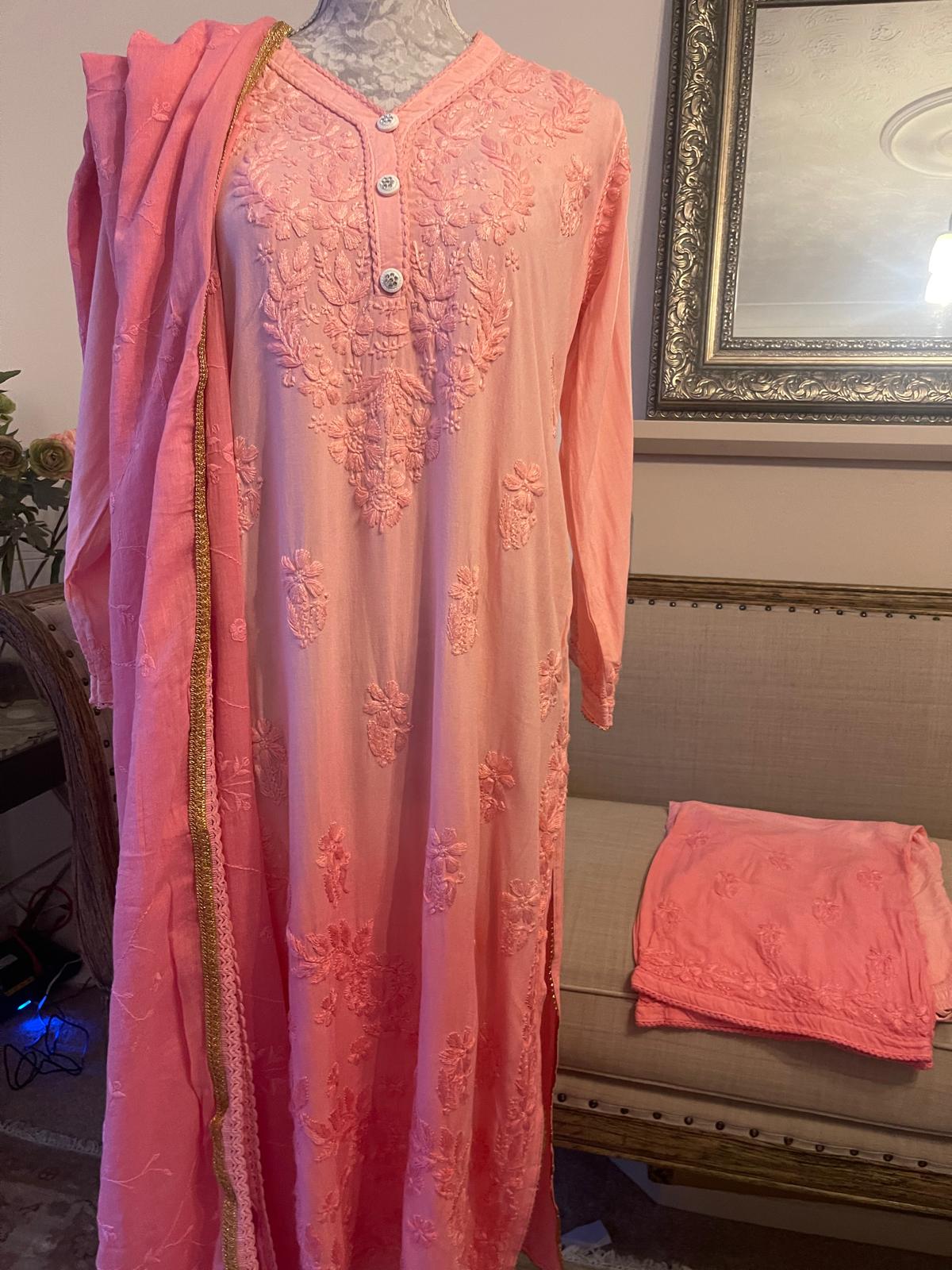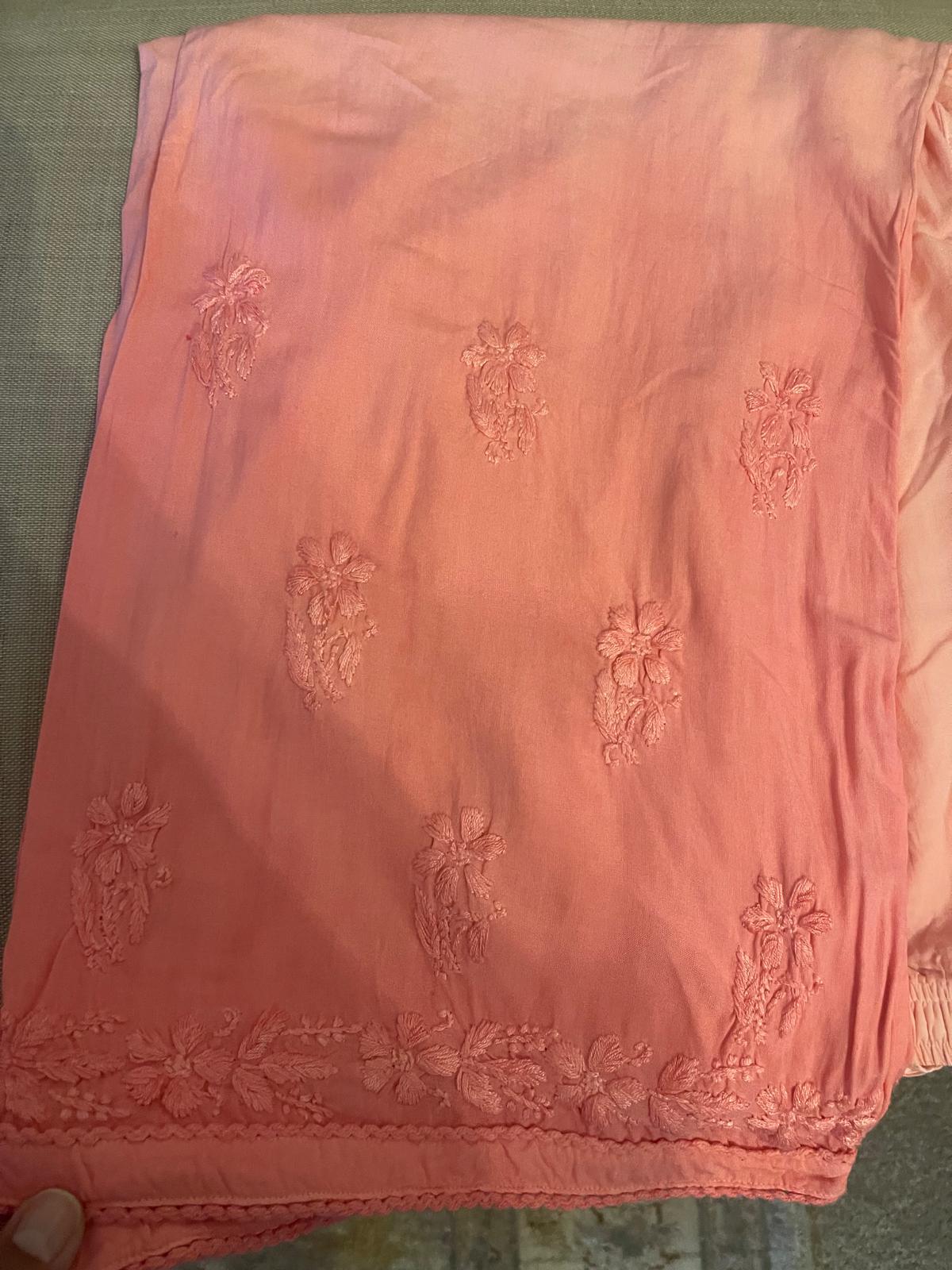 Blush Veil – Rose Faded Chikankari 3 Piece Set with Embroidered Trousers & Dupatta