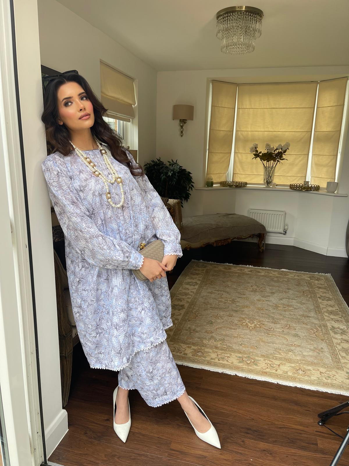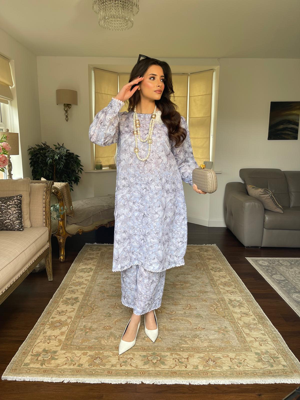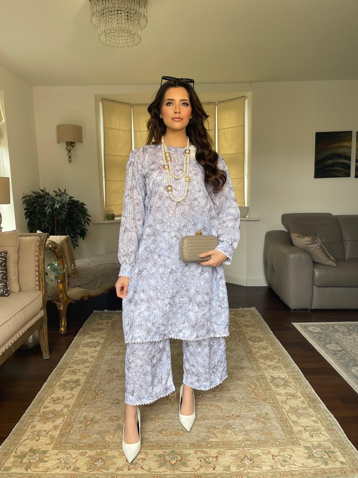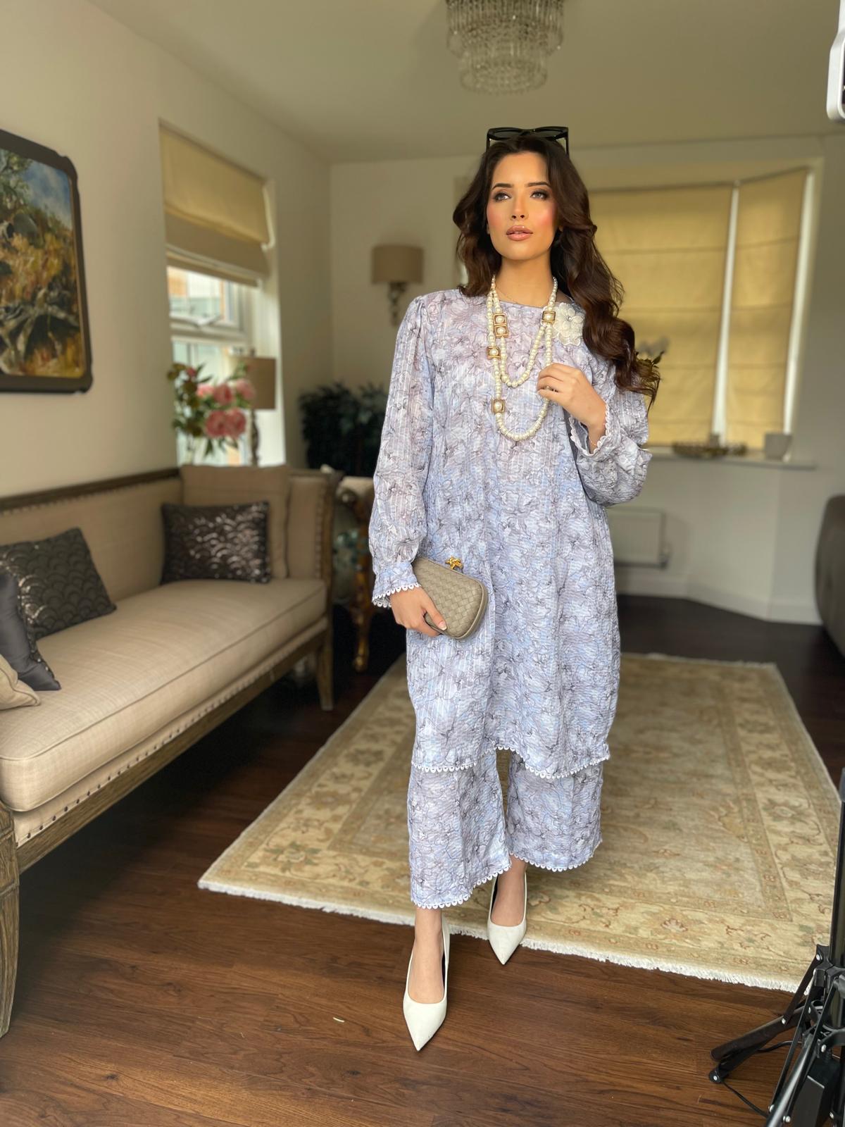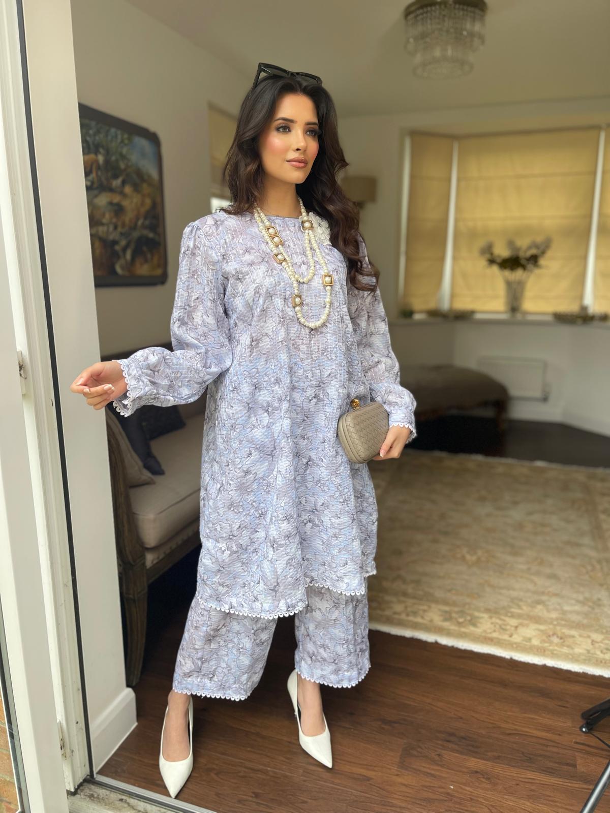 This two-piece set for women features a top and trousers crafted from a breathable cotton mix, ensuring comfort throughout the day. The top is adorned with delicate flower and lace embellishments, adding a touch of elegance. The trousers come with practical pockets, making this ensemble both stylish and functional. Perfect for any casual or semi-formal occasion.