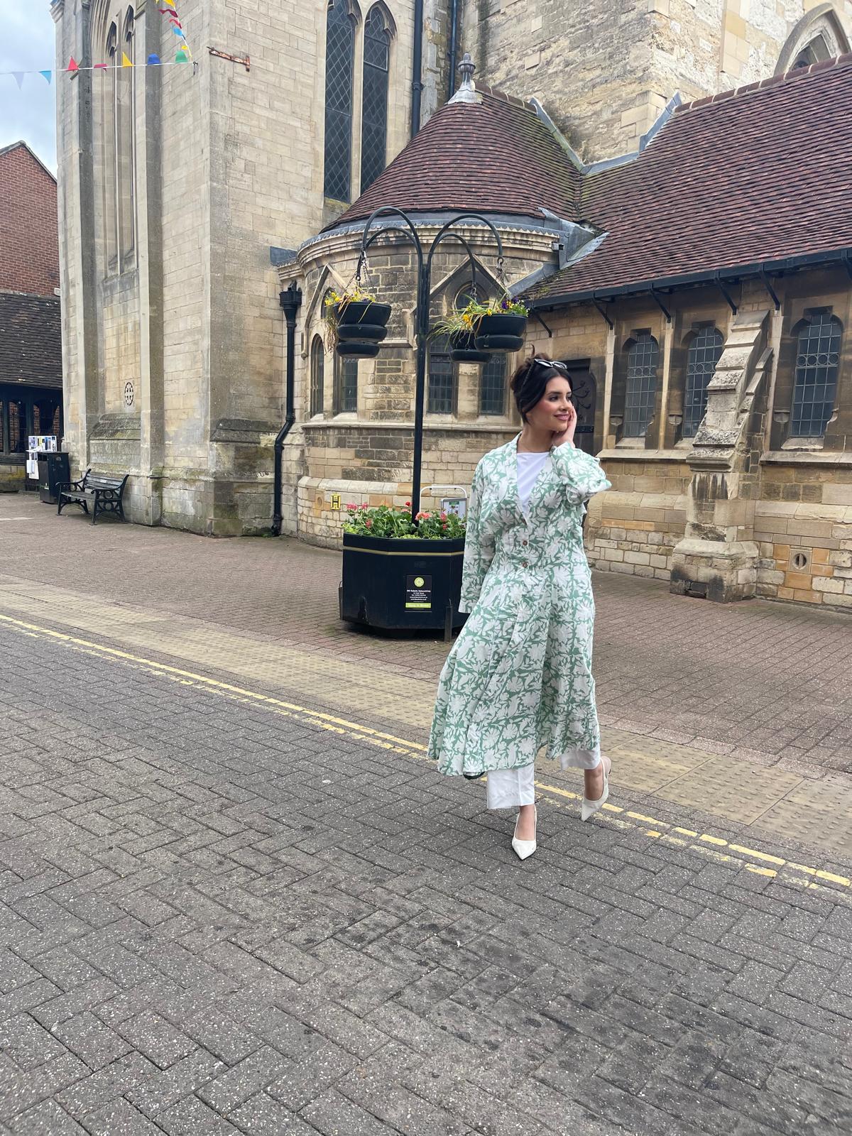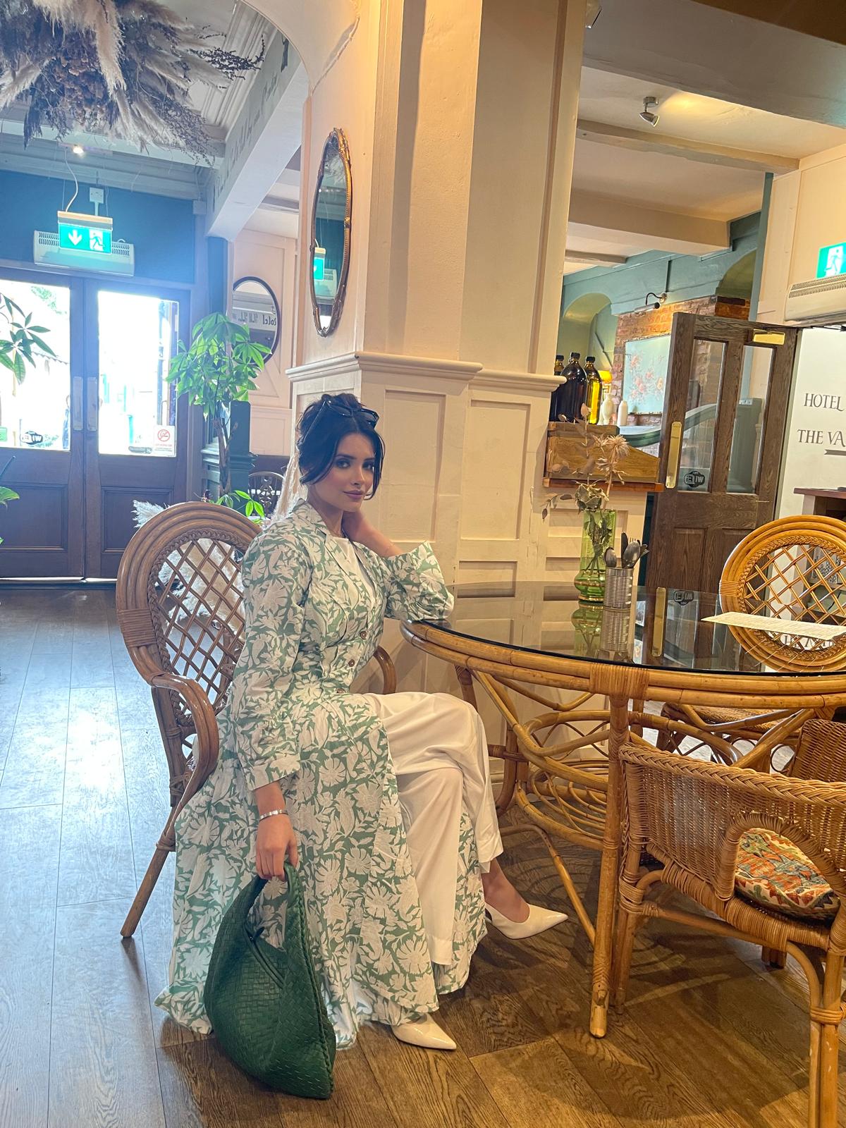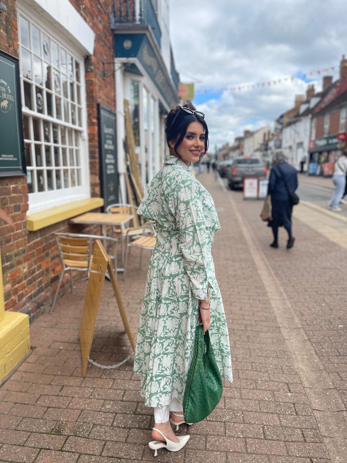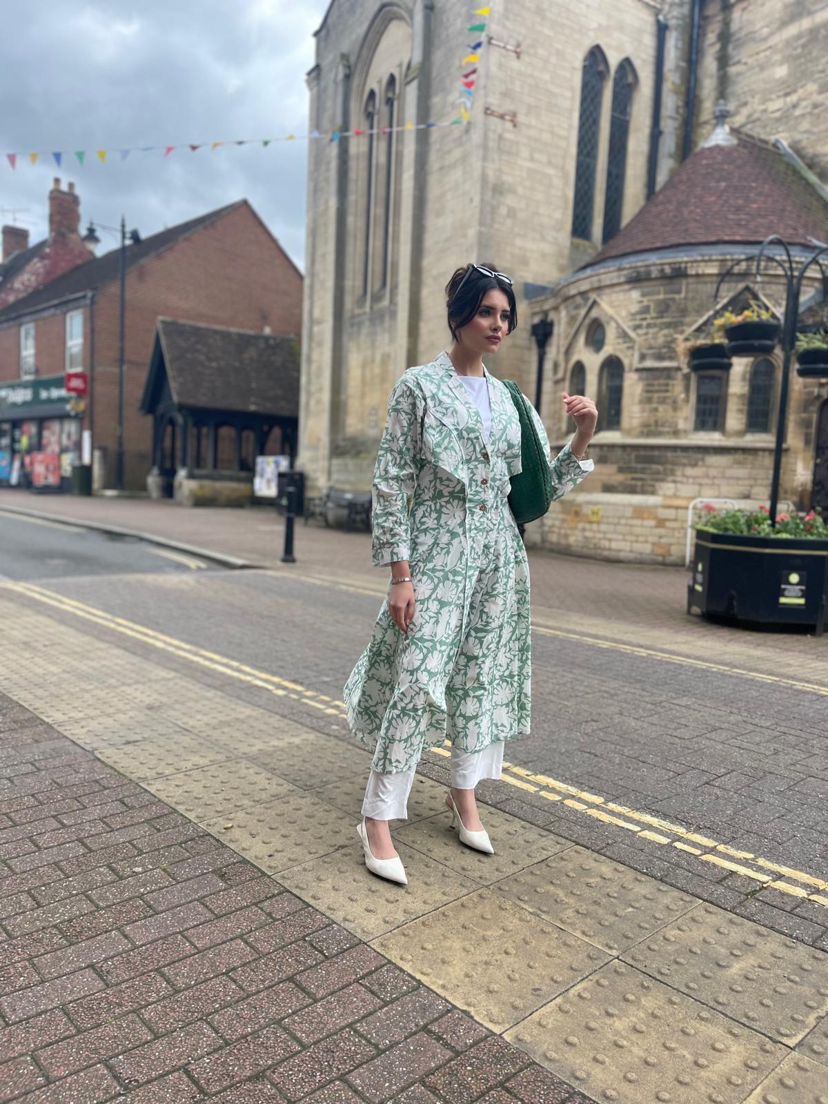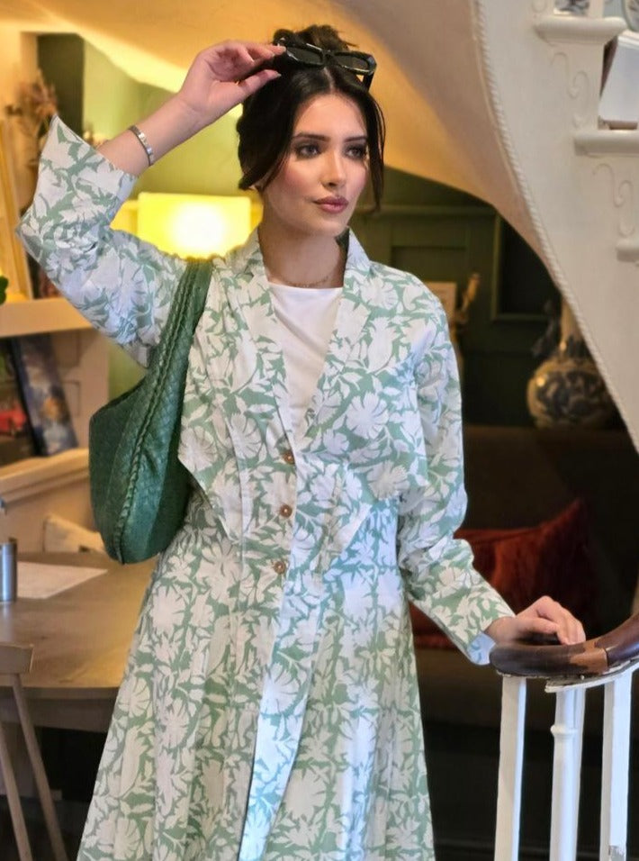 Introducing our latest addition to your wardrobe: the epitome of elegance and comfort. Crafted from 100% pure printed cotton fabric, this piece boasts versatility and style. With its unique blend of a trench and kimono, adorned with pleated detailing and a flattering silhouette, it's perfect for any occasion. Complete with a 3-button open cover-up, this garment adds a lovely twist to your ensemble. Flaunt your style effortlessly with this chic and sophisticated attire.