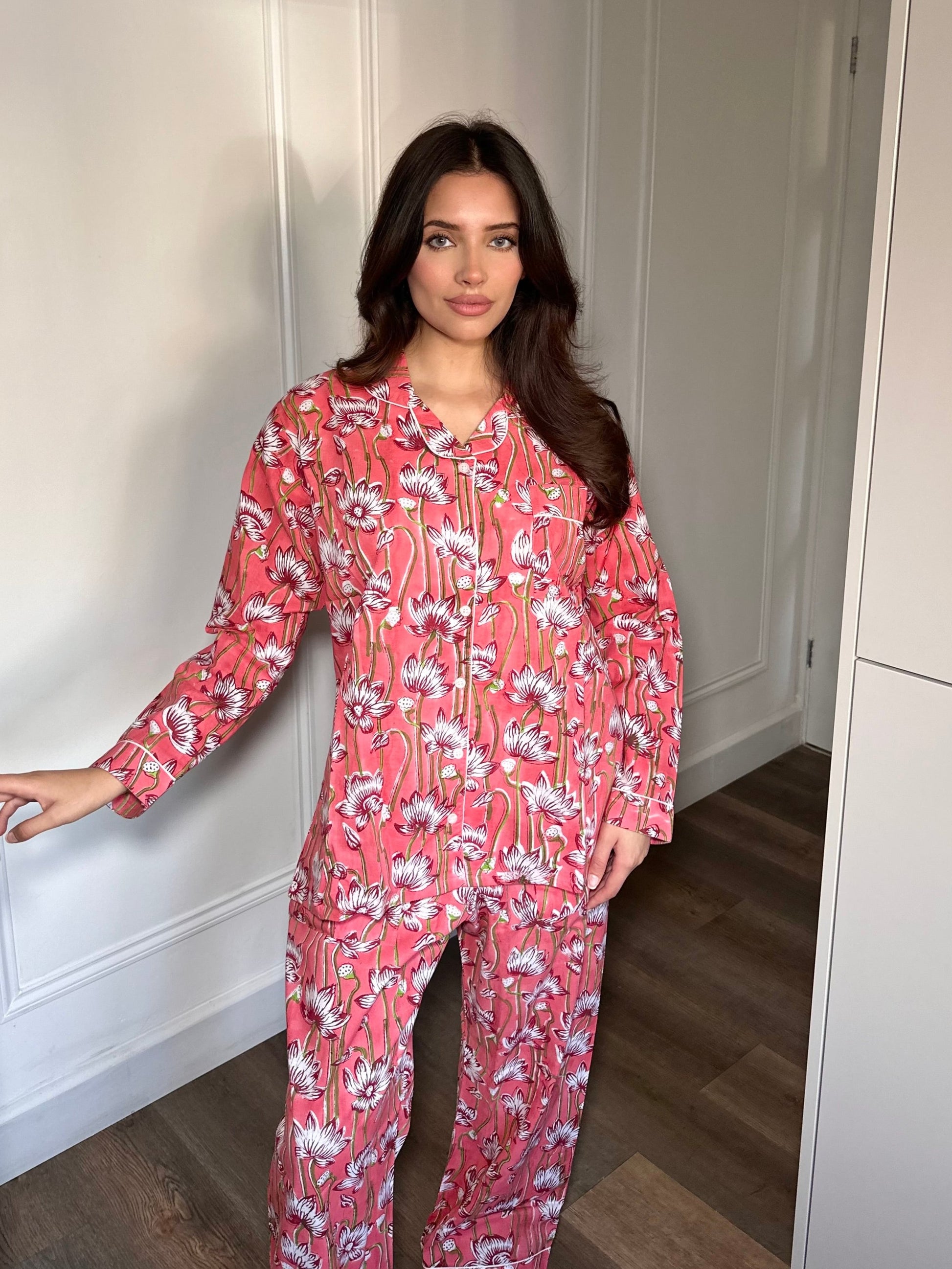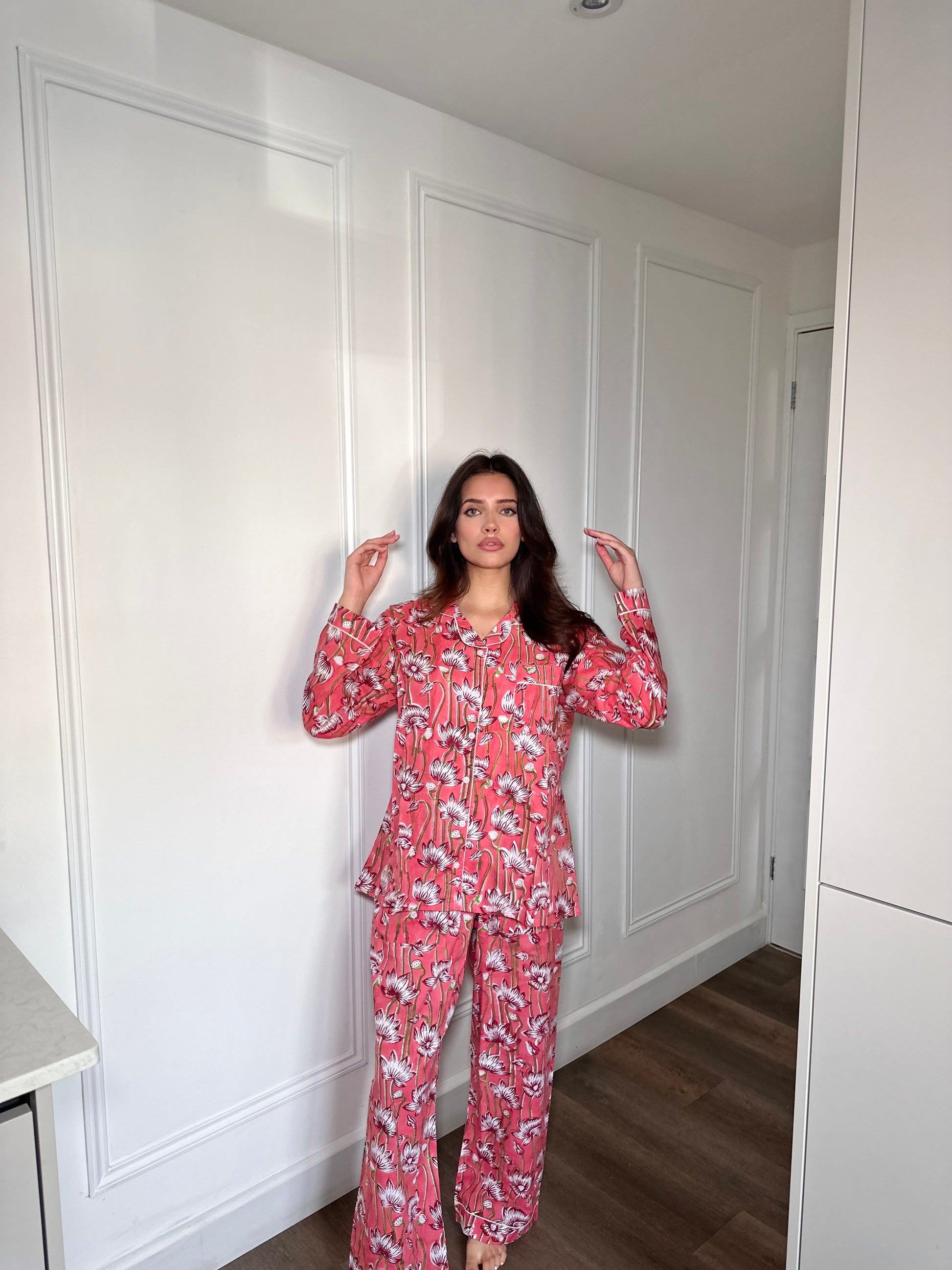 Relax in style with this women's loungewear pyjama set, featuring a delicate flowery print in soothing pink and white hues. Designed for ultimate comfort, the set includes a soft, breathable top and matching pants, perfect for cozy nights and lazy mornings. The timeless floral pattern adds a touch of elegance to your downtime, making this pyjama set a must-have for your loungewear collection.