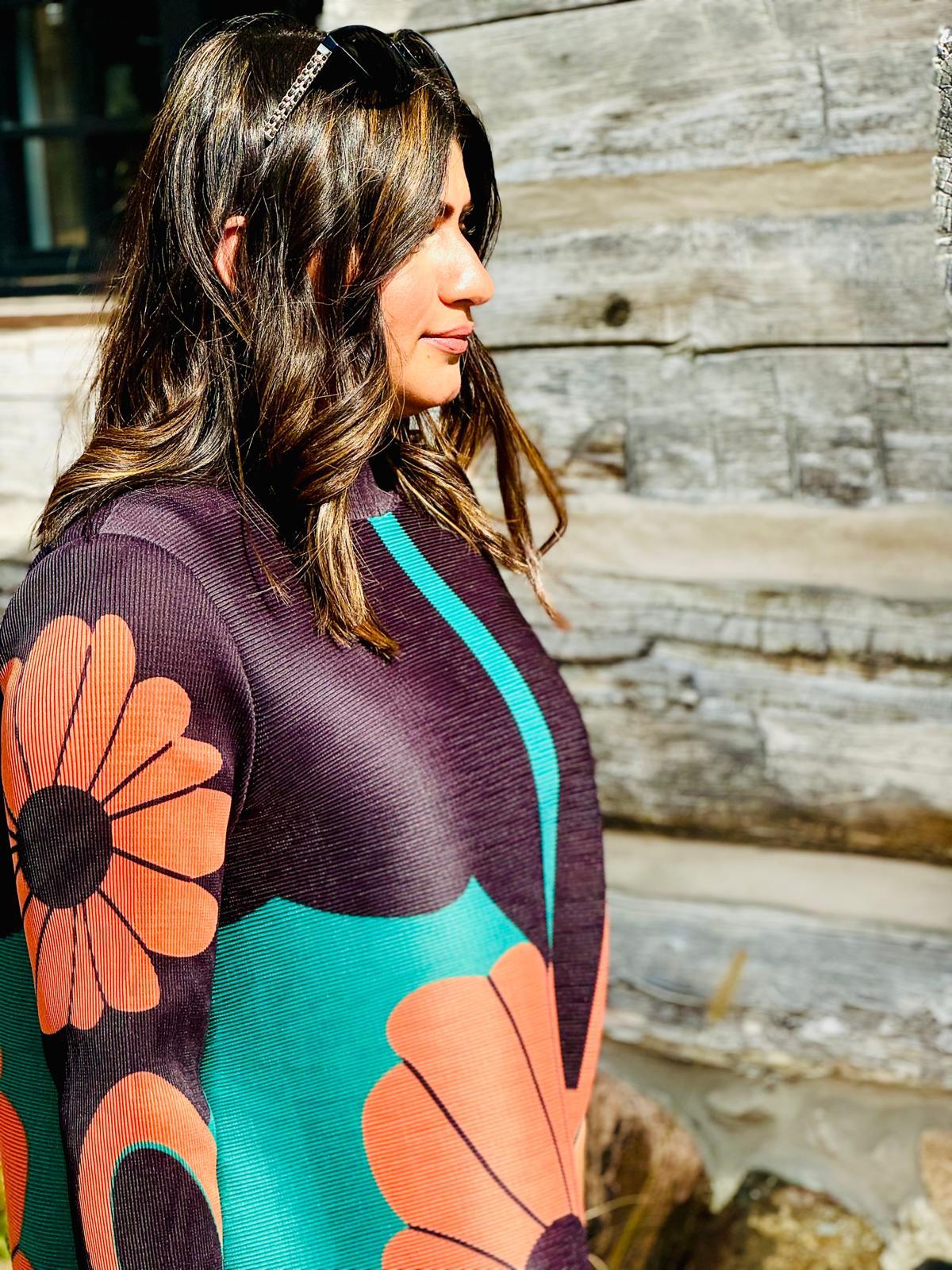 Make a statement this season with this black printed high neck pleated dress. Featuring a bold floral print, this dress combines elegance with a touch of drama. The high neckline adds sophistication, while the pleated design creates movement and a flattering silhouette. Perfect for day-to-night transitions, this piece pairs effortlessly with both ankle boots and heels for a look that’s chic and versatile. Elevate your wardrobe with this must-have floral dress.