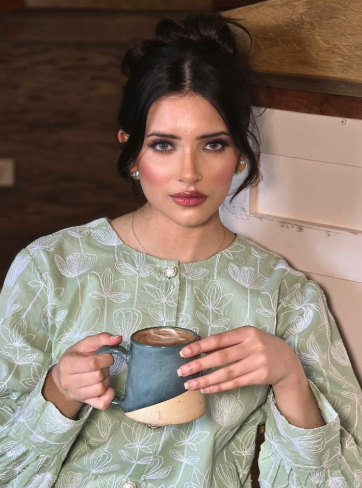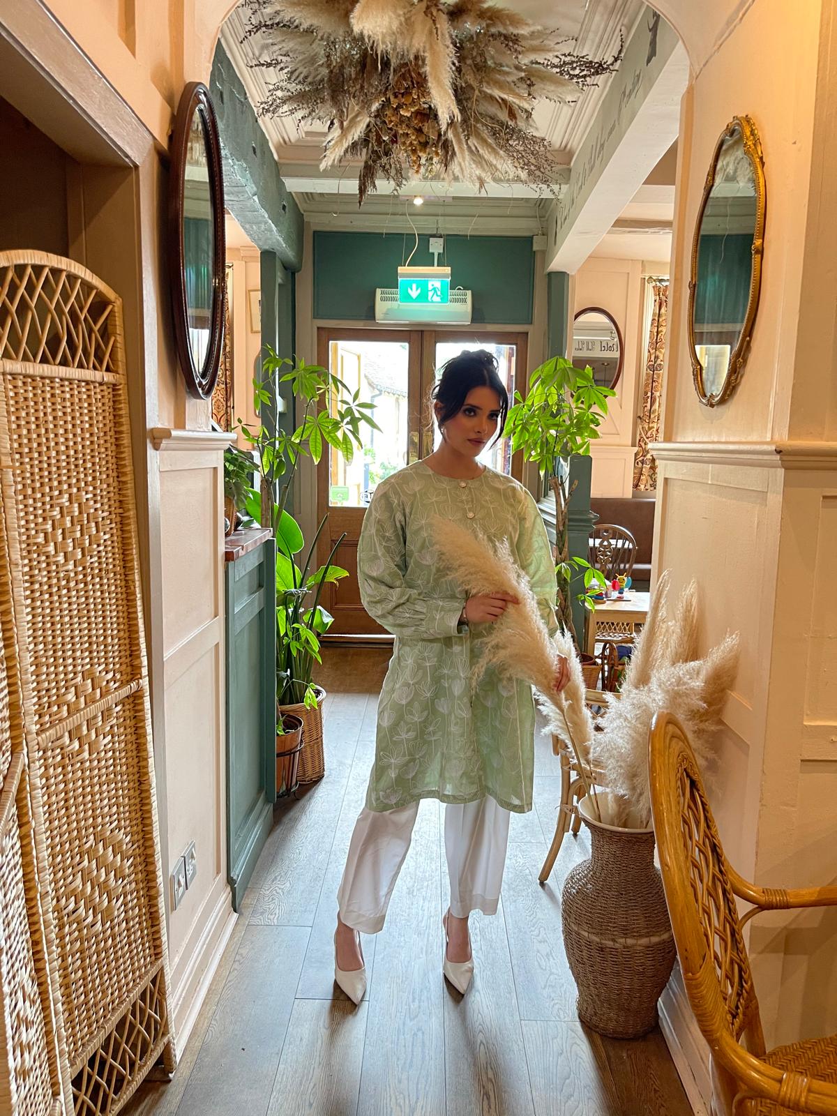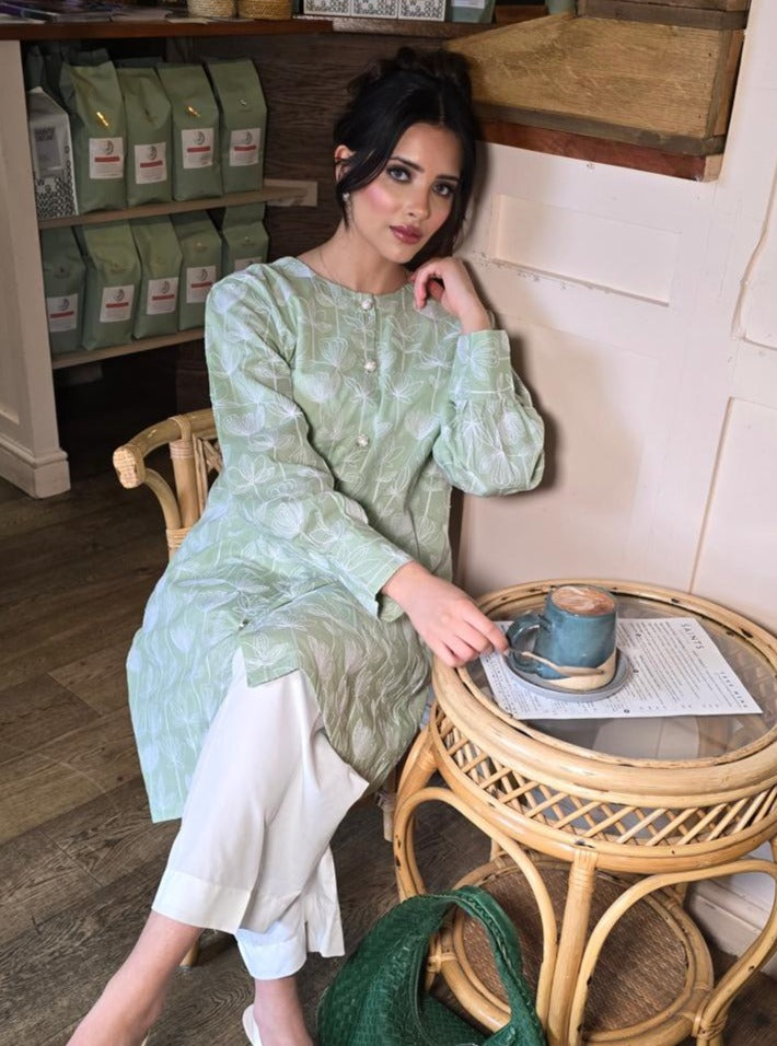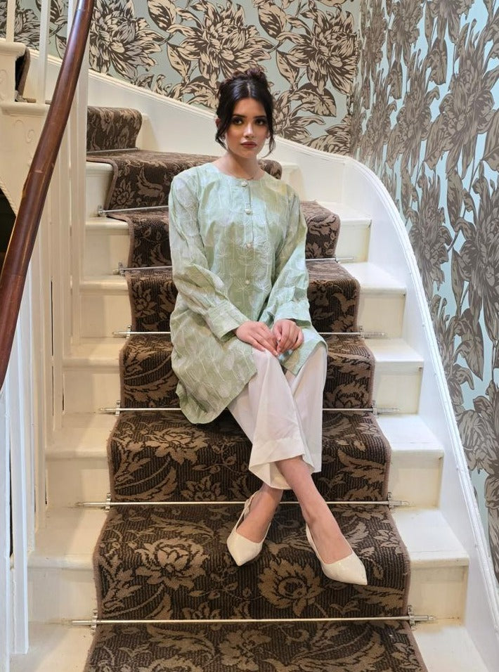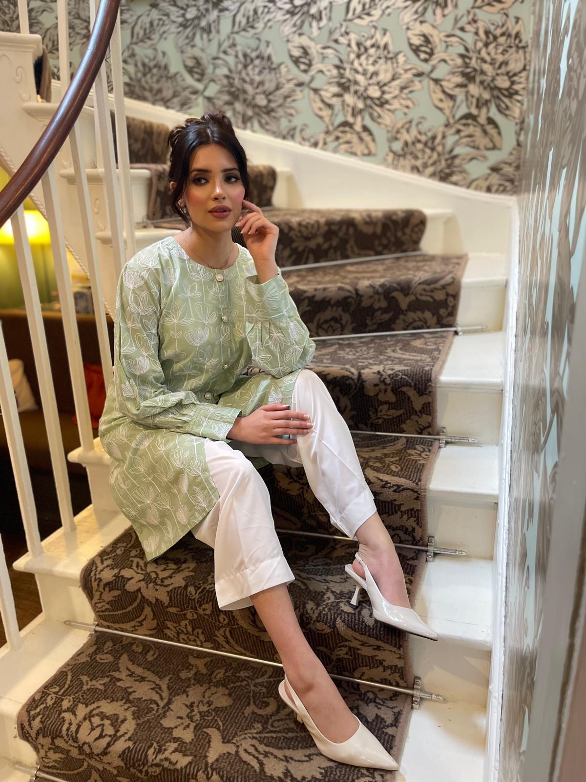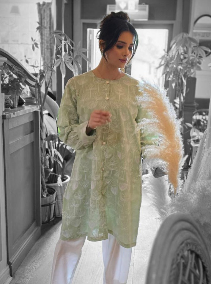 Elevate your wardrobe with our exquisite fusion wear, epitomising elegance and sophistication. Our women's clothing features beautiful white embroidered tulips delicately placed on pastel-hued fabric, creating a mesmerising visual delight. With front buttons adding a touch of charm, this piece seamlessly blends tradition and contemporary style. Flaunt your elegance effortlessly.