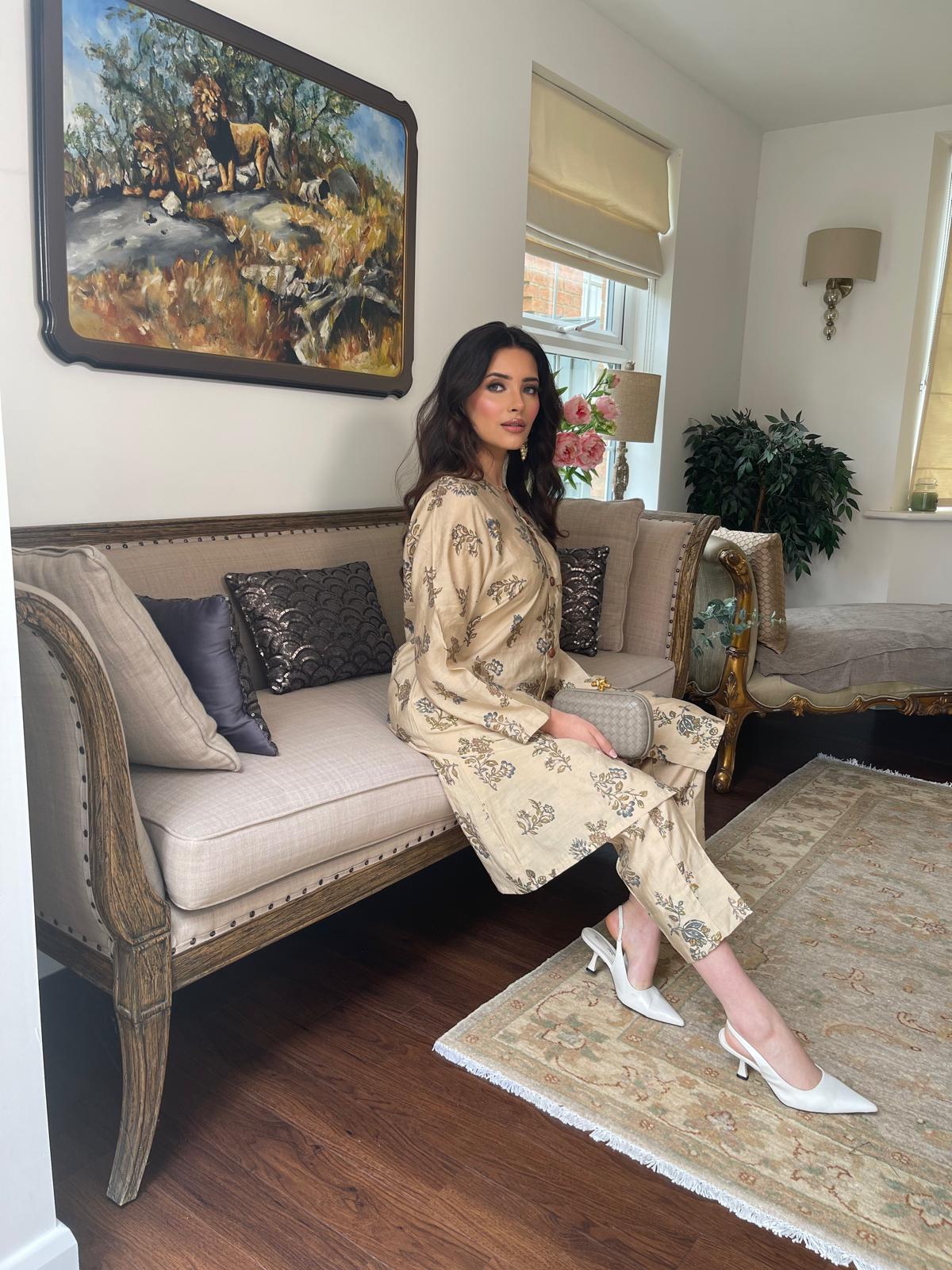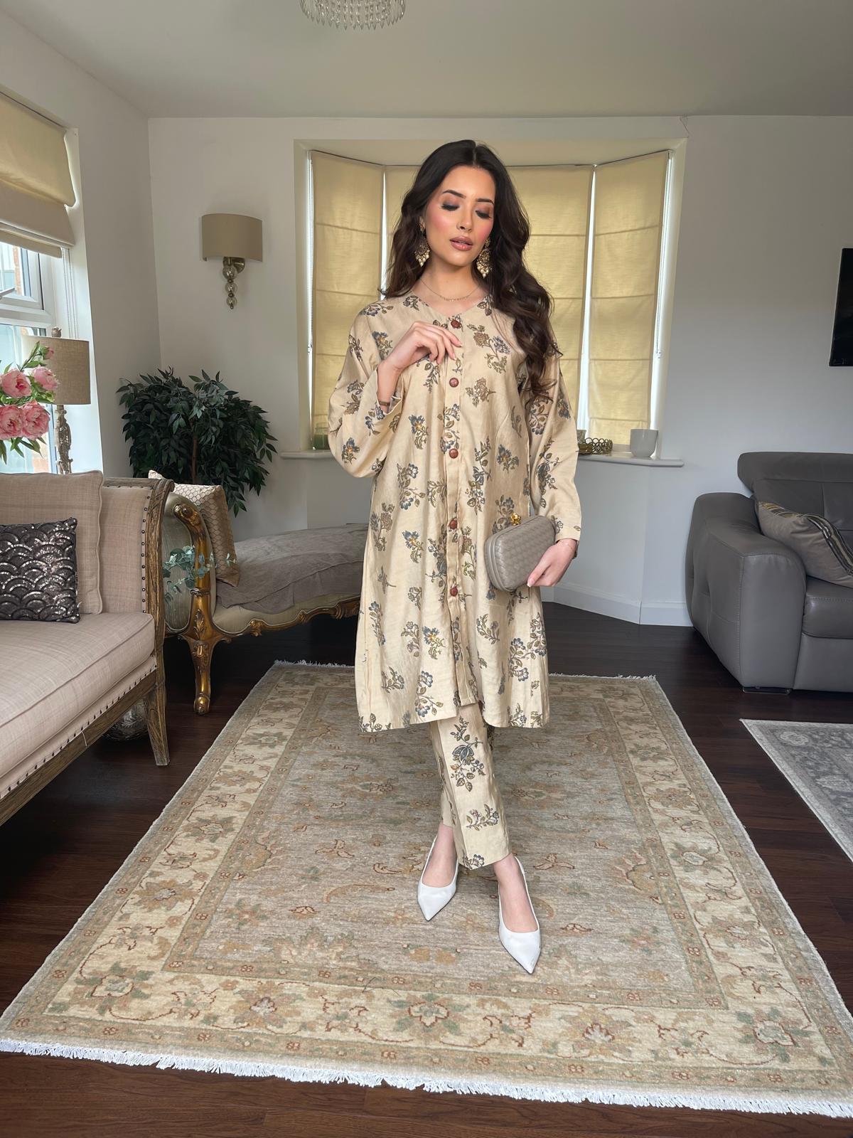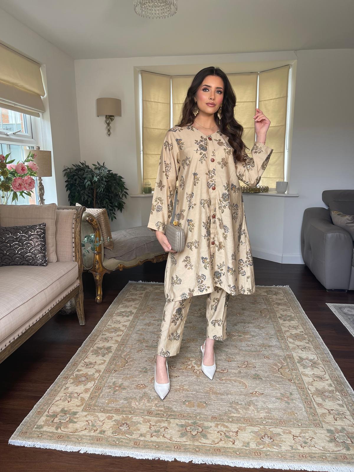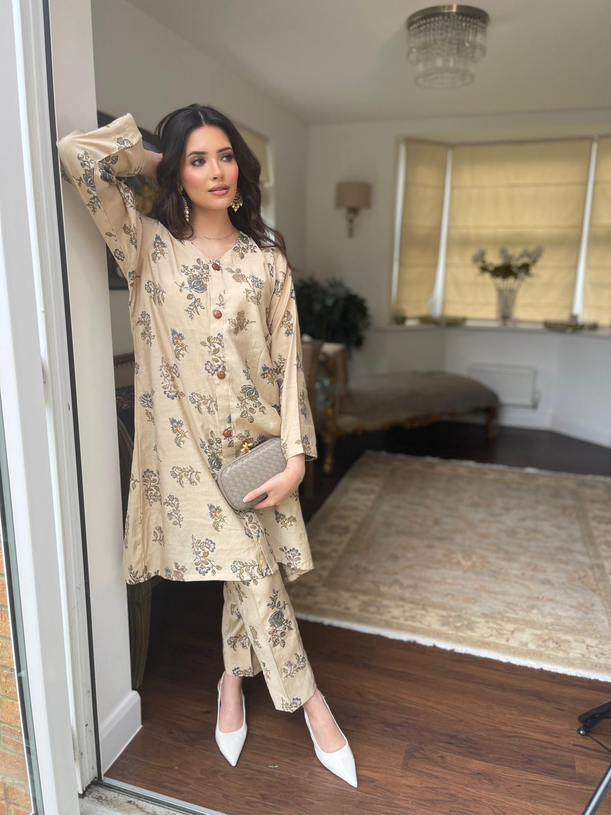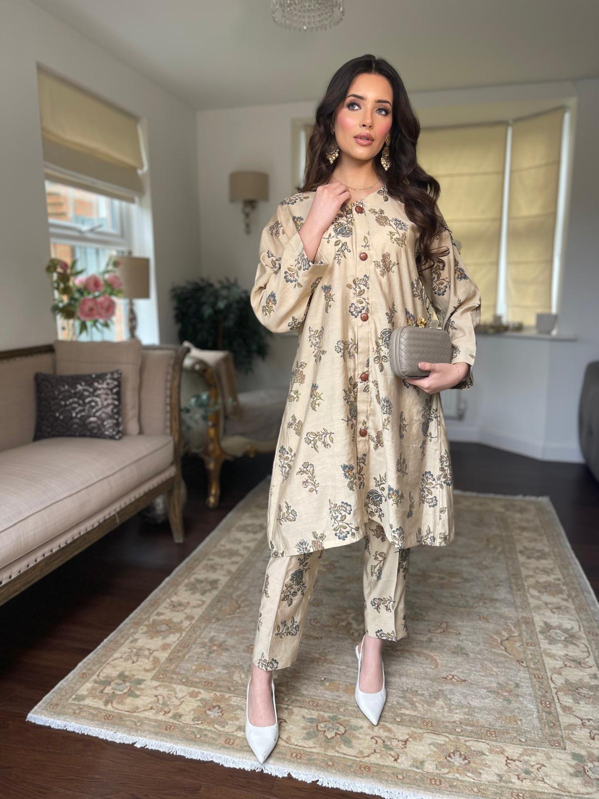 This stylish two-piece set features a breathable cotton silk fabric, combining elegance with comfort. The top boasts front-open tailoring and intricate button detailing, offering versatility to wear it open or closed. Paired with cigarette trousers, this outfit is perfect for both casual and formal settings, making it a chic addition to any wardrobe.